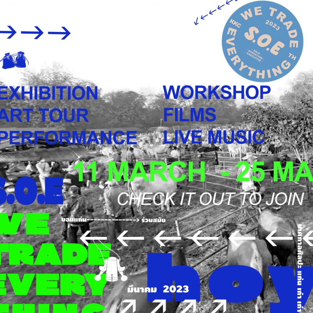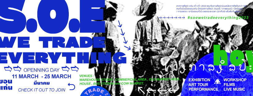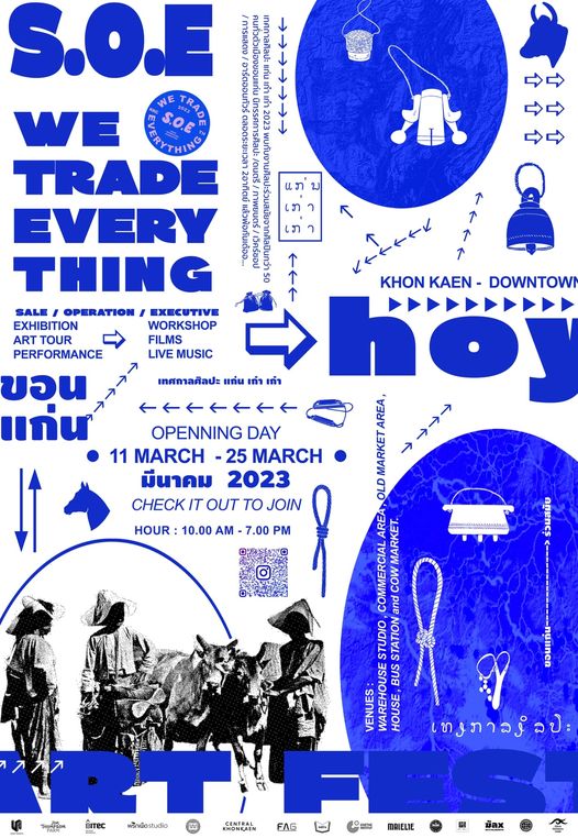 Kaen Kao Kao 2023 : S.O.E We Trade Everything Kaen Kao Kao: S.O.E We Trade Everything The art festival which happened to be an open art space in community, to connect with the history, lifestyle, and contemporary culture. In such of the cognition of social context that collaborate with people in general, local people, artists, and any whom interested in art. The previous of Kaen Kao Kao: S.O.E Our City Old Town art festival in 2021, participants were invited to learn about the history of the old city, the first community to be founded as a wide variety of people who travelled from many places, for many reasons, to what is now known as Khon Kaen. Participants are invited to follow the path of Khon Kaenโs historical movements through the lense of modern art, to see the impact of domestic, and international trade forces that changed a community into a city. The exhibition intends to stimulate the imagination of audiences and inhabitants of the old city, to be able to understand and become a part of creative reminiscence. This includes the perception on diverse experiences as a part of working together to develop the future of our city.