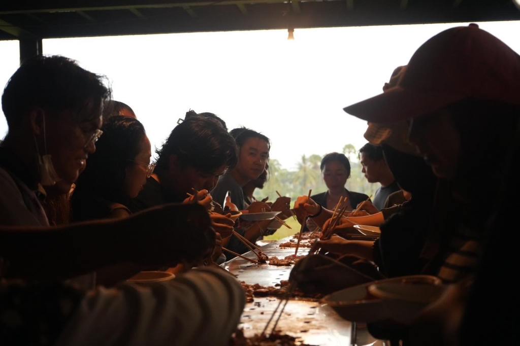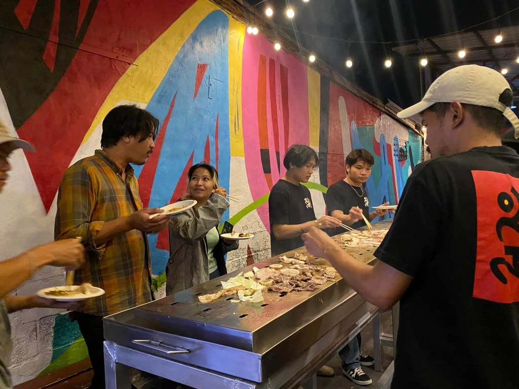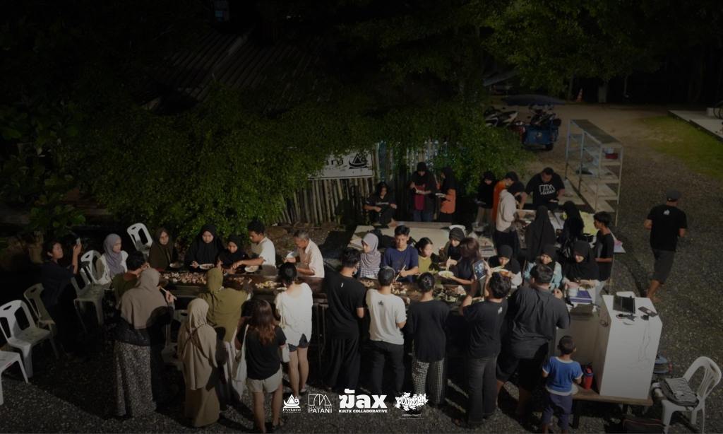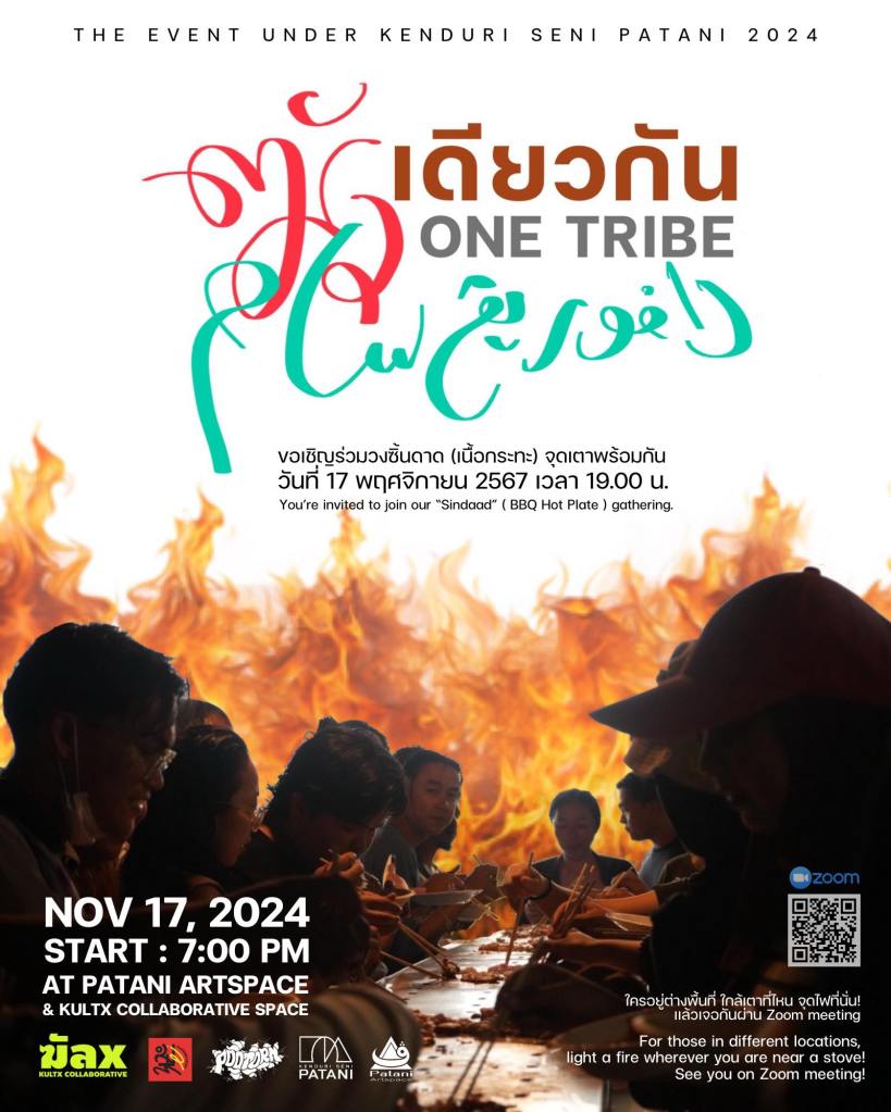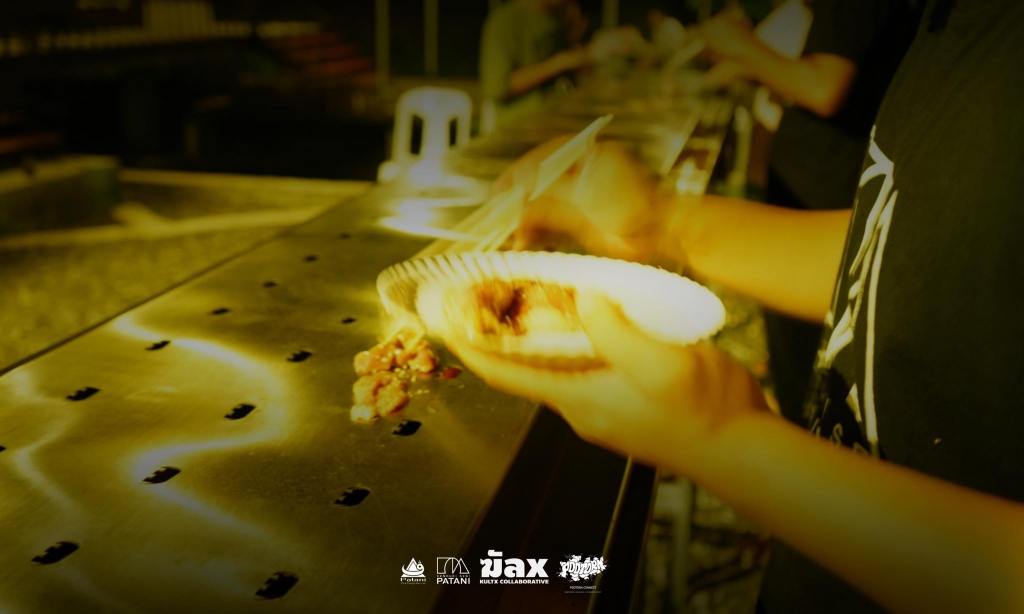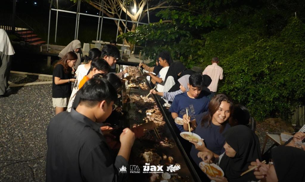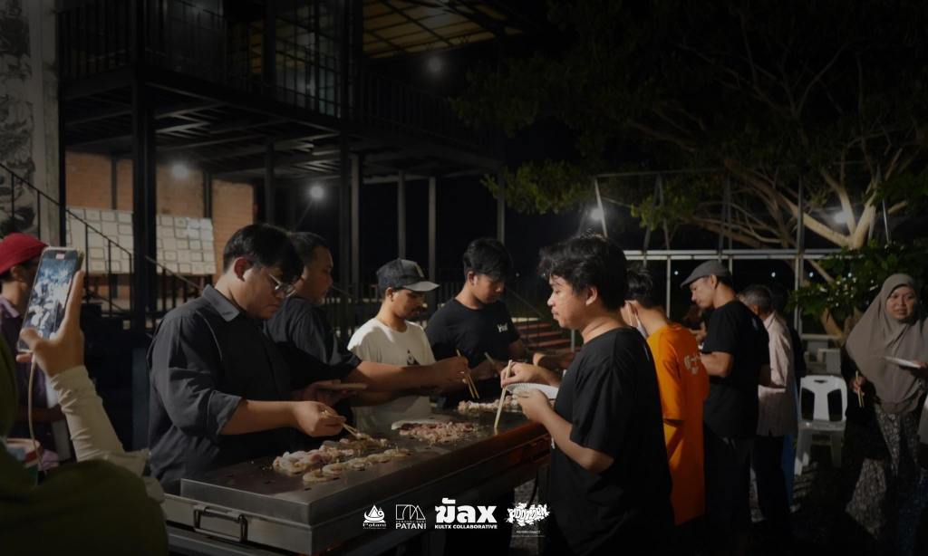 Now, this piece has traveled to the Kenduri Seni Patani festivalโa space embracing cultural, religious, and lifestyle diversity, much like a community festival. Kua Deaw Kan / Kenduri Seni Nusantara – One Tribe invites locals, artists, and attendees to join in, socialize, and enjoy Sin Dad. Adding color and flavor to the event, participants are encouraged to bring dipping sauces from their homes or regions, facilitating an exchange of tastes and stories. This cultural dialogue unfolds over a long halal Sin Dad grill, symbolizing the Friendship