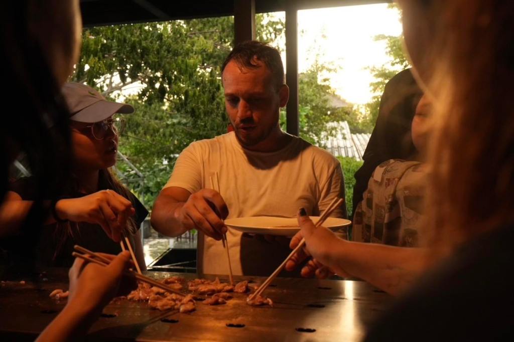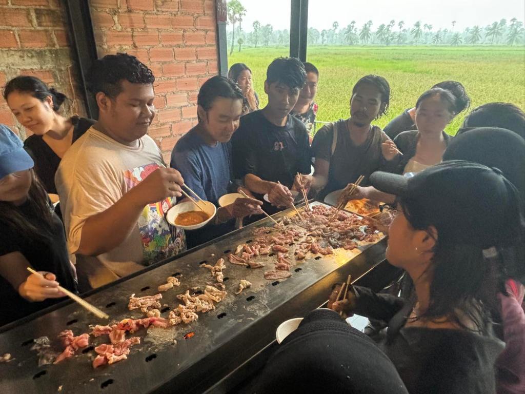 This artwork initially started with the Kultx Collaborative artist group from Khon Kaen and The Lost JigSaw artist group from Laos. The exhibition title, Kua Deaw Kan (โOne tribe โ), might not necessarily signify unity in happiness, but rather it reflects the shared impacts experienced by people whose ways of life are influenced by different states of governance. Despite this, these impacts resonate with individuals on both sides of the river. If Sin Dad is a food that embodies the shared identity of people living along both banks of the Mekong, it may serve as a comfort, offering a momentary escape from hardship. Alongside the conversations shared with those gathered, the tenderness of the grilled meat paired with a rich dipping sauce defines this meal, as interpreted by the artists.