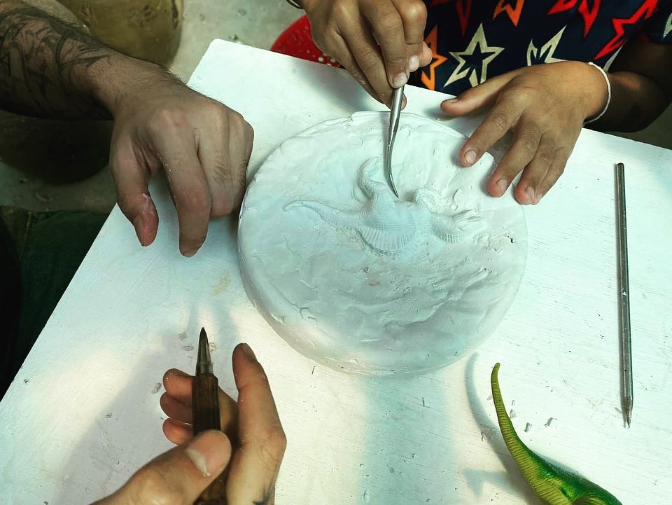 การเดินทางข้ามชุมชน เวลาลงไปทำงานร่วมกันเยาวชนในชุมชนมิตรภาพเพื่อที่จะทำกิจกรรมสัมมนาเชิงปฏิบัติการหรือ workshop โดยนำวัสดุที่พบใกล้ตัวคือปูนปลาสเตอร์ หุ่นไดโนเสาร์ของเล่นพลาสติกมาประดิษฐ์เป็นฟอสซิลส่วนตัว การเล่นดังกล่าวนี้ทำให้เรานึกถึงความเชื่อเกี่ยวกับสิ่งศักดิ์สิทธิ์หรือสิ่งที่หายไปแล้วแต่ถูกปลุกให้มีชีวิตขึ้นมาใหม่ผ่านเทคโนโลยีหรือการผลิตซ้ำไม่ว่าจะเป็นเหรียญผสมมวลสารศักดิ์สิทธิ์ที่ถูกบดอัดเข้าด้วยกันกระทั่งกลายไปเป็นวัตถุเพื่อการบูชาเครื่องรางที่ให้สรรพคุณต่าง ๆ ตามความเชื่อของแต่ละคน เช่นเดียวกับฟอสซิลที่ทำให้โลกของเพื่อนไดโนเสาร์ที่สาบสูญตกมาอยู่ในมือเรา
