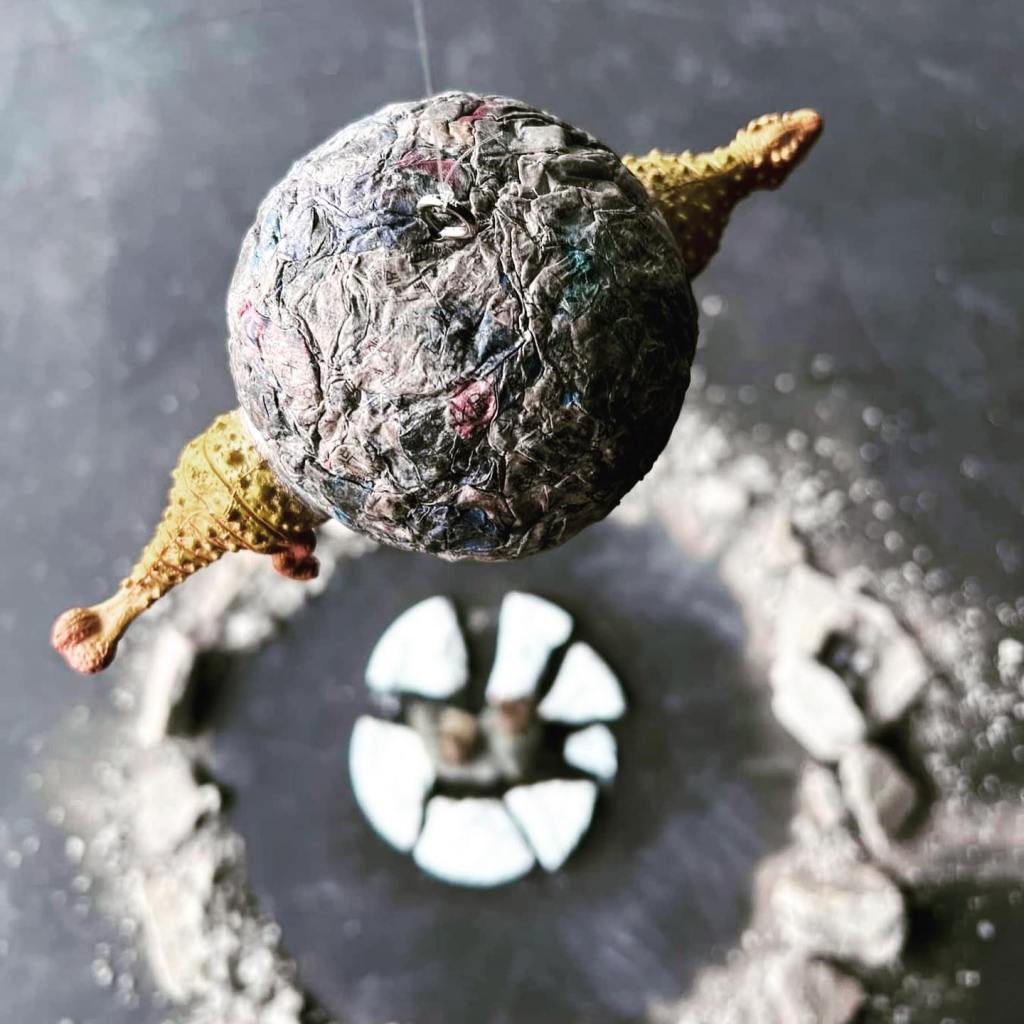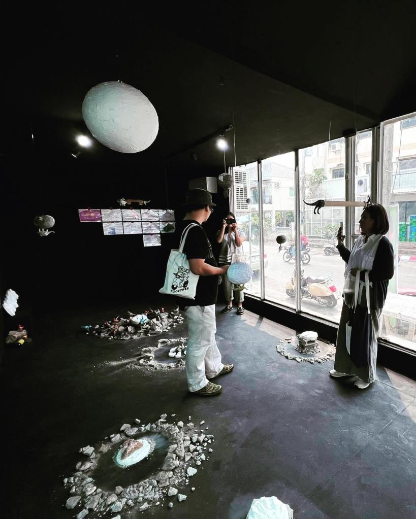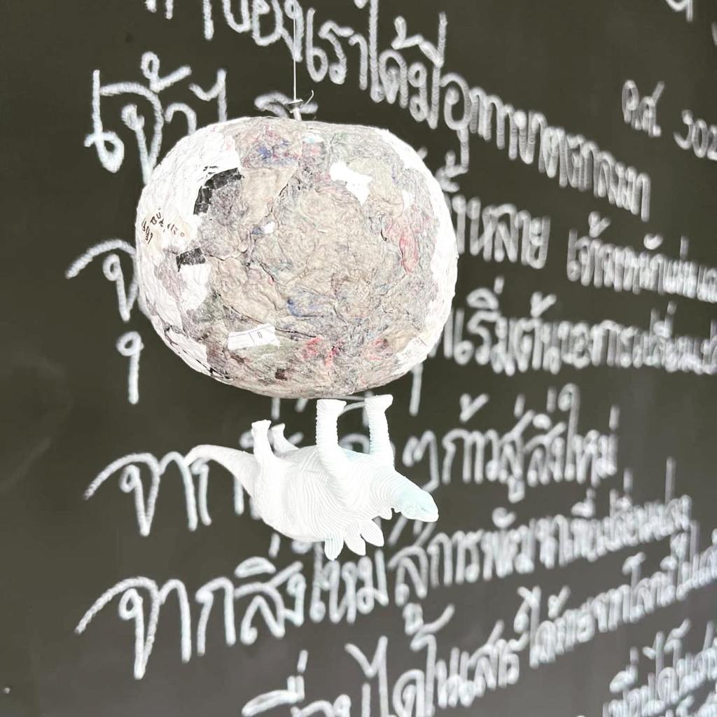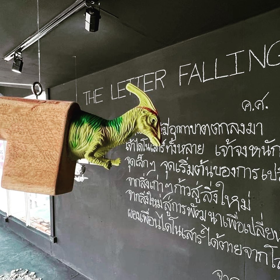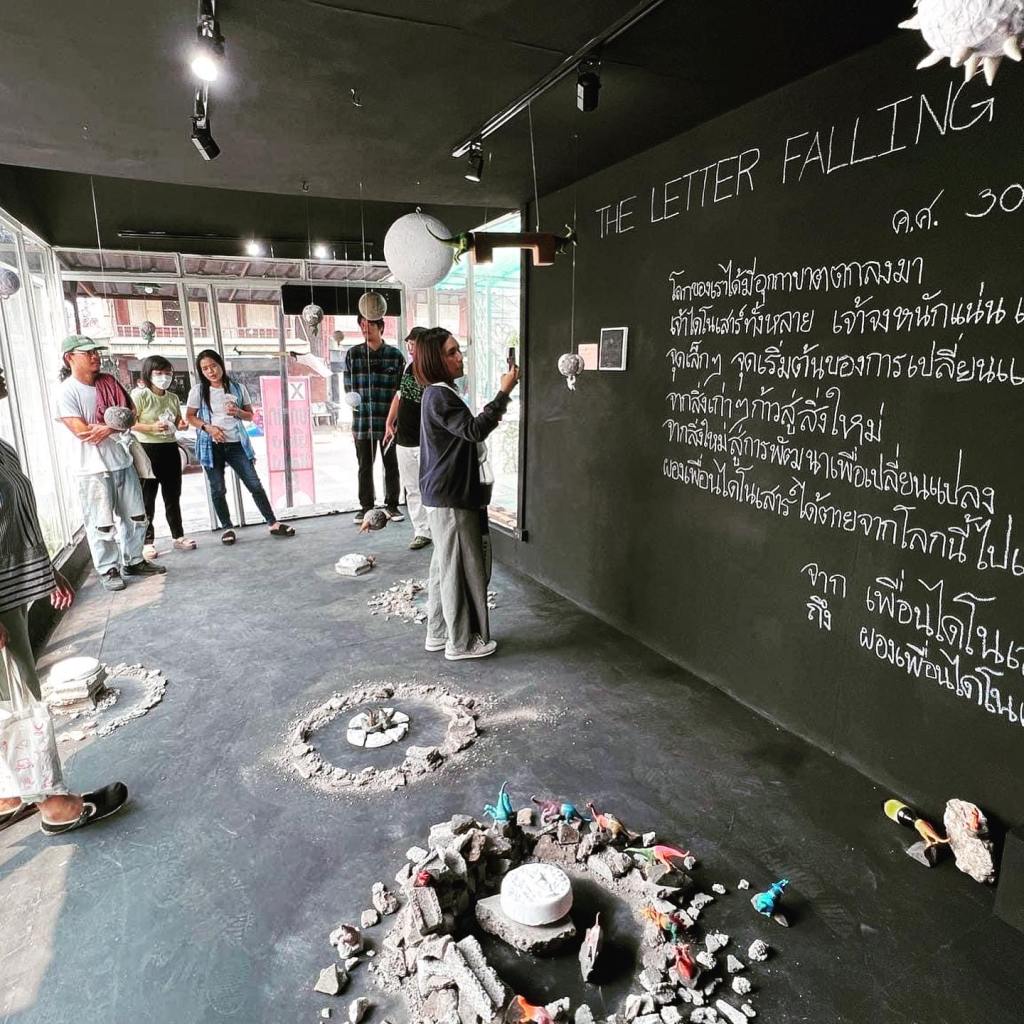 ข้อความลายมือเขียนด้วยชอล์กสีขาวบนพื้นสีดำตรงมุมห้อง ศิลปินต้องการเชื่อมคนดูเข้ากับการเดินทางไปยังอีกมิติของโลก ณ ยุคที่เพื่อนร่วมโลกของเราได้เกิดและตายเป็นฟอสซิลเสียทั้งหมดสิ้นแล้ว ผู้ชมต้องผ่านดงของสะเก็ดอุกกาบาต และฉากทัศน์ที่แต่งขึ้นจำลองผลของคลื่นการล้มตายที่เกิดกับเพื่อนต่างสายพันธุ์ จากแรงกระแทกของวัตถุนอกโลก กระแทกและฉีกร่างยักษ์ร่างน้อยให้ส่วนหัว ลำตัว หาง กระจัดกระจายขาดจากกัน เรื่องราวความรู้ที่คนในปัจจุบัน มีต่ออดีต ก็ถูกปะติดปะต่อ สืบสาวขึ้นจากชิ้นสวน คงเหมือนกับไดโนเสาร์ที่หัวหางมาจากคนละสปีซีส์ หรือวางเฉ เหหันไปคนละทาง